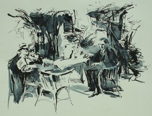 Rohrfeder, laviert, auf grünem Papier, 2016, 48 x 35 cm
